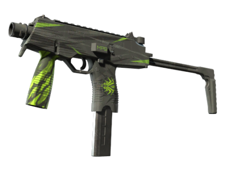 Manufactured in Switzerland, the cutting-edge MP9 SMG is an ergonomic polymer weapon favored by private security firms. It has been custom painted with dynamic, angular shapes and a stylized spider.